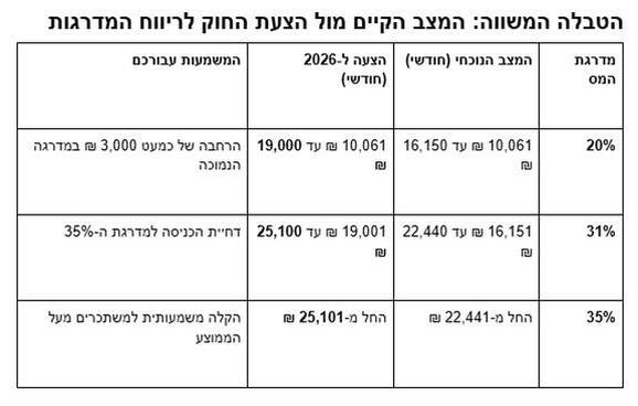 - מדרגת ה-31%: תחל רק מ-19,001 ₪ ותימתח עד ל-25,100 ₪ (במקום 22,440 ₪ כיום).