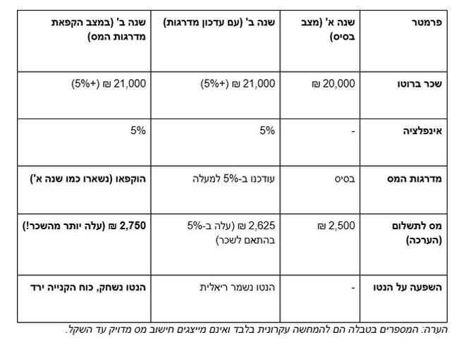 כדי להבין את המספרים, בואו נסתכל על טבלה שמציגה תרחיש היפותטי של עובד שקיבל העלאת שכר בגובה האינפלציה (5%), ובודקת מה קורה למס שלו במצב של עדכון מדרגות לעומת הקפאה.